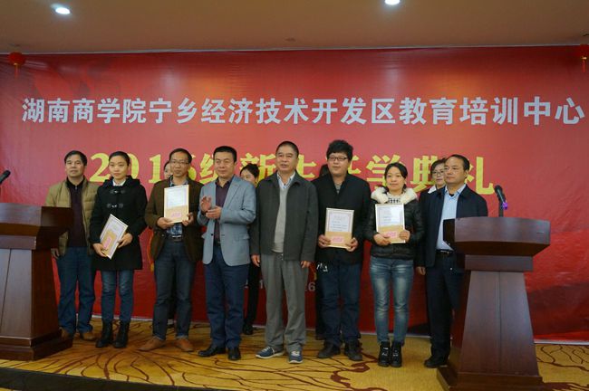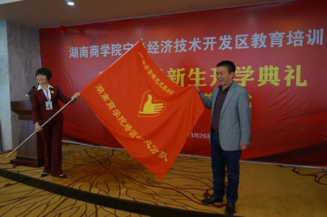 阳春三月,春意盎然。3月26日上午,湖南商学院国家级宁乡经济技术开发区教育培训中心2016级新生开学典礼暨志愿者授旗仪式在创业大楼后勤服务中心二楼会议室隆重举行。200余名学员参加了典礼。宁乡经开区党工委副书记黄瑶、总工会主席王子进、湖南商学院继续教育学院院长熊卫平、副书记张孟秋及相关部门领导出席了开学典礼。