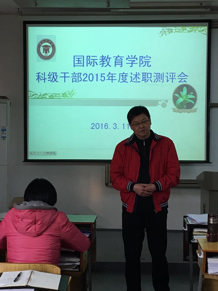 3月11日,国际教育学院在201召开科级干部2015年度述职测评会,全体教职工参加会议,国际教育学院书记吴明育主持。 按照《国际教育学院科级干部年度考核实施方案(试行)》,各位科级干部走上讲台向全体教职工汇报了2015年度德、能、勤、绩、廉方面履职履责情况,全体教职工以认真负责的态度填写了科级干部2015年度工作考核测评表,对每位科级干部进行民主测评。 ![]() 测评结束后,国际教育学院院长张漾滨作了总结讲话,他首先说明了召开此次测评会的三个目的,一是对科级干部一年来的工作表示尊重;二是让大家展示自己的工作业绩;三是通过反思、总结,提升工作质量。他同时表达了参加此次测评会的感受,要求大家珍惜机会与平台,自始至终贯彻“认真”两字,不仅要认真工作,而且要认真述职总结。工作效果好、工作效率高,述职总结却不到位,既为难了本部门的同仁,也为难了参与测评打分的同志,最后对自己的测评结果也有不好的影响。最后,他对2016年度学院工作的开展提出了明确的要求,一是加强工作的计划性,学院各部门要进一步完善工作计划,对每个工作事项都要列出时间、进度,切实加以落实;二是加强团队建设、树立团队意识、提振团队精神;三是要以获得学校2015年度二级教学单位考评优秀单位为契机,巩固成绩,改进不足,把学院工作推上新的台阶。(文/杨建 图/赵新月)