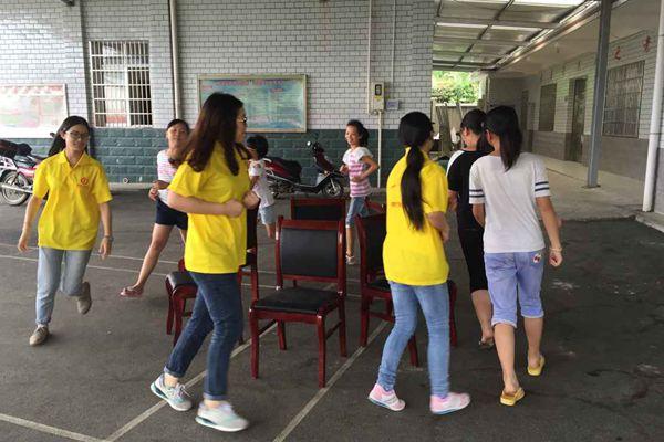 游戏第一项是抢凳子。小朋友们十分热情的搬出了7张凳子,由杨秋媛老师担任裁判。大家在音乐声中欢快的围着凳子跑起来,随着音乐的戛然而止,大家迅速地抢占凳子,淘汰落单的大朋友和小朋友,并抽走一个凳子。随着游戏的进行,最后剩下了两个优胜小朋友,并获得了小礼品。 游戏第二项是躲猫猫。每个小朋友带领一个队员为一组,分为四组,三组队员在一定时间和范围内躲起来,由另一组来找寻,最先被找到的一组就换出来找寻其他队员。游戏第三项是丢沙包,刚才还在紧张访谈的课题组成员罗丽珍也参与进来,与小朋友玩得不亦乐乎!
