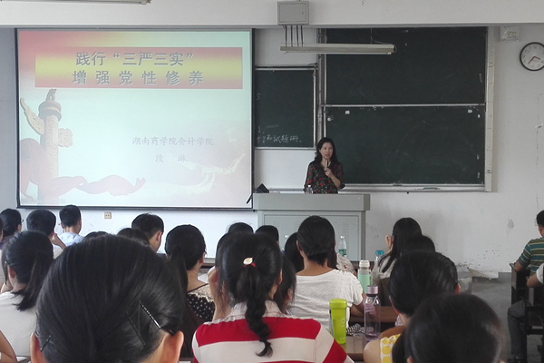 6月16日,会计学院学生党支部在日新楼D204教室举行“践行‘三严三实’,增强党性修养”主题教育党课,党课由党总支副书记李吉林副教授主持,会计学院党总支书记段琳教授给全体学生党员授课。 ![]() 总支书记段琳主要就三严三实的主要内容及其内在逻辑,开展专题教育的意义,如何以三严三实呼唤党性修养新境界这三个方面来为党员们讲授。课上,总支书记段琳深入浅出地解读了习近平总书记关于“三严三实”讲话精神的重要内容和基本要求,并指出,学生党员要树立远大志向,严格修身律己,发挥先锋模范作用,把三严三实内化为内在修养。在总结时,总支书记段琳希望学生党员要做一个正直、宽厚、有理想的人。 会计学院党总支副书记李吉林副教授结合期末考试以及“三严三实”主题教育党课,号召全体学生党员同志结合加强专业道德和党性修养的要求,充分发挥党员的先锋模范作用,诚信考试,弘扬正气,在日常生活中践行“三严三实”、成长成才。(曾丽 岳琼)