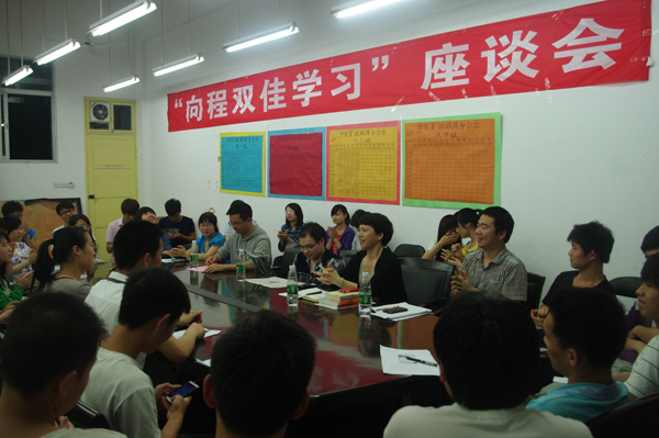 程双佳发言,他介绍了自己的基本情况并希望与大家进行充分交流。同学们踊跃发言并积极提问。程双佳就同学们提出来的学习、工作、生活等方面的问题进行了交流。在双佳谈起关于自己在英语学习、课外阅读、专业学习等方面的经验时,同学们都感到深受启发。座谈会气氛轻松,欢笑不断。