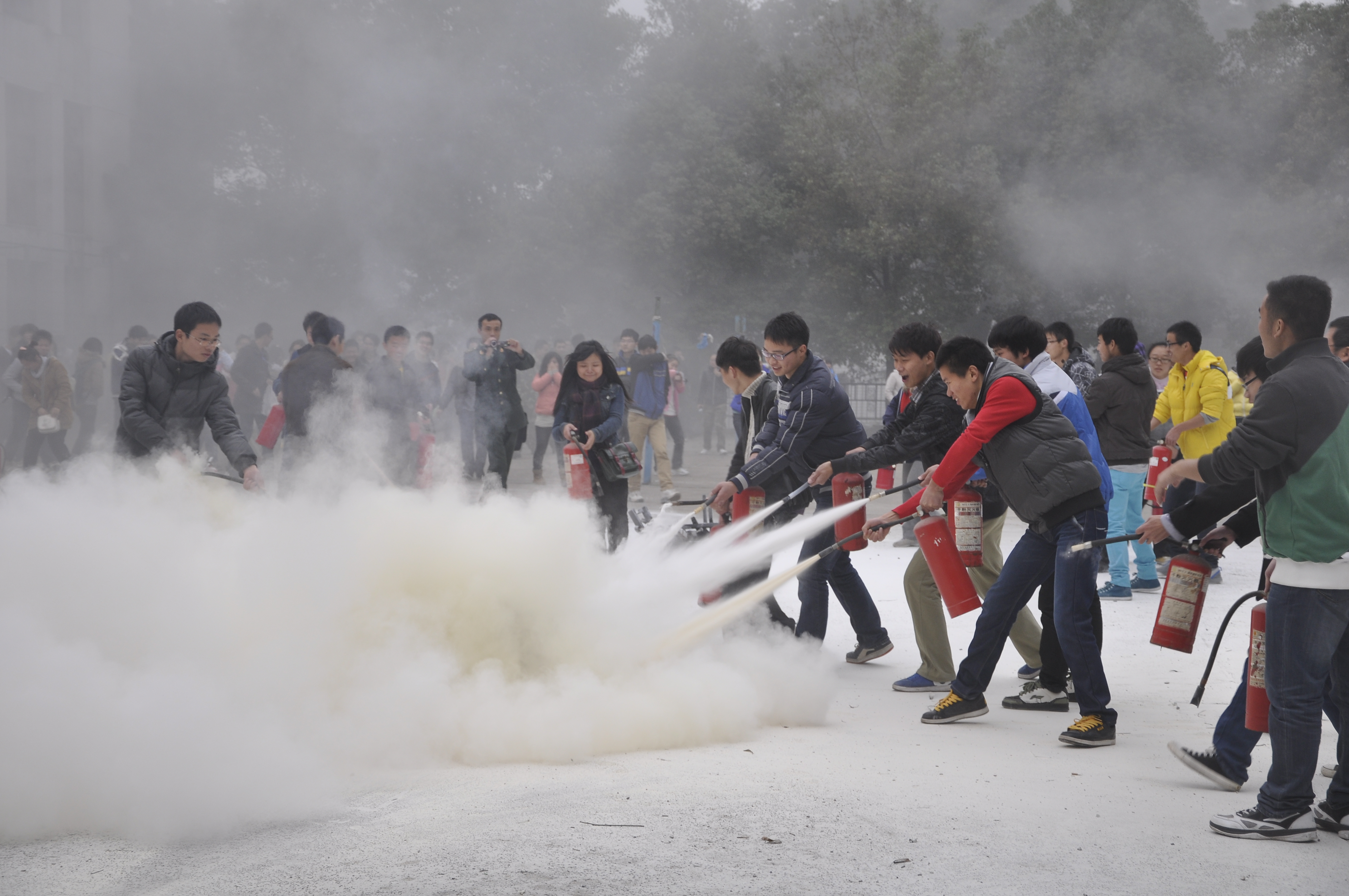 消防安全队队长向大家介绍了干粉灭火器的用途、使用方法及基本步骤,并示范灭火,随后,队长组织引导现场同学进行灭火操作。
