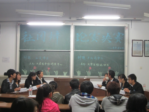11月18日晚,工商管理学院社团辩论赛决赛在D305拉开帷幕。正方大学生市场调查中心与反方大学生物流协会就&“知足常乐&”与&“不知足常乐&”展开激烈辩论。工商管理学院学生会主席,副书记与学社联主席作为评委参加此次辩论赛。