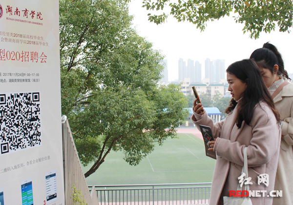 招聘会场外的海报上有招聘会二维码,学生用手机一扫就可以入场。