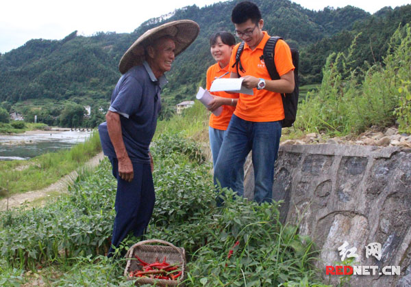 同学们与老爷爷在辣椒地里进行了交流。 红网怀化7月16日讯(通讯员 周鑫 龙炜琳 记者 刘怡斌)近日,湖南商学院暑期“三下乡”青春奋斗实践团师生实地走访湖南省怀化市新晃县扶罗镇东风村、刘家村、伞寨村等村落,通过实地走访、发放问卷、对话交流等形式,在村里开展关于侗藏红米种植情况及其电商销售情况的调查。 实践团全体成员分别进入农户家中,详细了解侗藏红米种植情况及红米电商平台的建设现状。一位73岁的老人告诉实践团成员,自己是受惠者之一,种植红米给他带来了丰收的喜悦。另外,老人对国家精准扶贫政策也赞不绝口,国家发放种子和肥料等生产资料给村民们带来了实惠,同时他希望作为“中国重要农业文化遗产”的侗藏红米能让更多人了解并且受益。 坐在轮椅上的姚大爷曾是农民生产合作社的社长,带着大伙一起集中生产红米,助推社员每家每户脱贫。随着年纪增大,他不幸偏瘫,但仍然不忘种植红米改善了生活。 在刘家寨通往伞寨的路上, 实践团成员碰上劳作归来的田大叔。田大叔表示,以前家里很穷,自己的田也种植过高产量的水稻,但收入还是难以维持生计,后来政府提倡耕种红米,不仅免费发放种子,还统一收购等,这给大家带来了很大的收益。现在家里收入高了,生活也好了。 此次调查中,实践团成员与当地村民进行了良好的沟通并获取有效信息,也感受到了夜郎古国农耕文化魅力。
