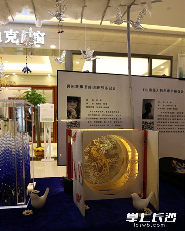 长沙晚报掌上长沙5月26日讯 (记者 徐媛 通讯员 巢进文 实习生 刘珊) 从“看得见的声音”到“有灯影的书籍”,从“江永女书的工艺呈现”到“长沙方言的艺术创新”……昨日下午,一场别开生面的“艺术展”在红星美凯龙长沙岳麓商场一楼亮相,这场以“创·出彩”为主题的“艺术展”,是湖南商学院设计艺术学院2017届毕业生毕业设计作品展。 此次毕业设计作品展将持续一周的展览时间。 图片均为长沙晚报通讯员 巢进文 摄