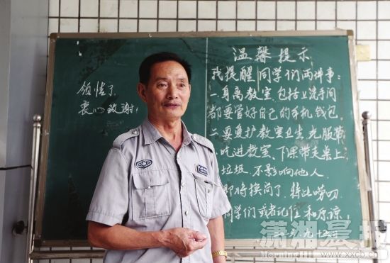 9月16日,湖南商学院,保安周仕莲与他写的温馨提示。 图/潇湘晨报记者 陈正 “我即将离岗了,特此唠叨。”9月15日,湖南商学院一保安离岗前,在教学楼前的小黑板上写下留言与学生“唠叨”,提醒学生注意防盗和卫生清洁,被学生拍下发至网络,很快引起热议。 这名平时话不太多,脸上挂着微笑的保安,在离岗前以这样的方式与学生告别,很多同学感觉不舍,并赞誉其为最暖心的保安大叔。 学生称其最暖心保安叔叔 9月16日,湖南商学院一保安在教学楼前的小黑板上留言的照片在网上大量转发,照片中,一保安正在小黑板前写着:温馨提示:我提醒同学们两件事:一、身离教室,包括上洗手间都要管好自己的钱包,二、要爱护教室卫生,克服带小吃进教室习惯,下课带走桌上的垃圾,不影响他人。我即将换岗了,特此唠叨,请同学们记住和原谅。 湖南商学院学生介绍,写下这段话的是在学校二教学楼的一名保安,因为其平时工作很细致,特别是能写一手工整的粉笔字,很多到教学楼自习学生对其都有印象。 “大冬天时候,超冷,看到我在等人,他就喊我过去烤火,特别感动。”、“是个超爱书法的叔叔,以前我们举办书法大赛他还帮我们开灯。”、“叔叔以前也写过很多温暖细节的贴心话提醒同学们。”、“经常背着他带早餐进去”,一些同学看到这名保安即将离开之后,表达着对他的不舍,并称之为“最暖心的保安叔叔”。