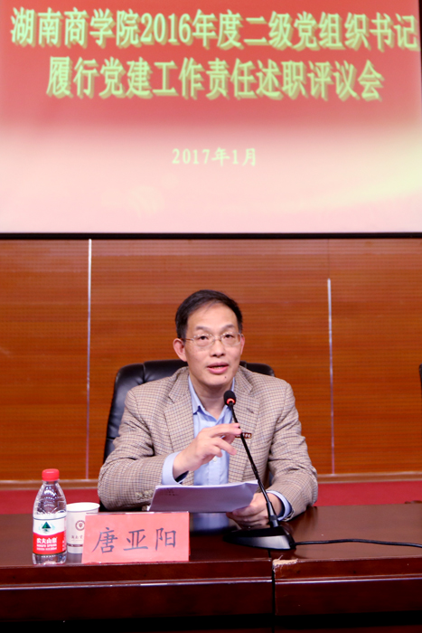 按抽签顺序,20位党总支书记、直属党支部书记一一上台,结合PPT展示,从领导班子建设工作、基层组织建设工作、宣传和思想政治工作、团群统战工作、创新与特色、存在问题与整改措施等方面,作了党建工作汇报。各二级党组织党建工作各有特色,述职中既晒成绩,也晾家底,真正把自己摆进去,剖析基层党建工作中的问题。 校党委书记唐亚阳对2016年度二级单位目标管理考核述职和二级党组织书记履行党建工作责任述职作了全面点评,并就2017年如何进一步做好考核工作作了部署。唐书记认为,目标管理考核综合测评和履行党建工作责任述职评议会,报告准备实、会务准备实、会场秩序好,各汇报单位负责人都采用了多媒体课件来展示成就,特别注意台风形象,体现了大家对会议高度重视、精心准备、积极参与。 唐亚阳书记从对“为什么要开考核述职会”、“考核述职到底考核什么”、“下一步如何做”等问题的思考,分析阐述了考核述职对推动学校各项工作的意义。他认为,考核述职是开展工作交流的重要平台,是检验工作成效的重要方式,是推进来年工作的重要抓手,是锻炼工作队伍的重要机会,是全面了解学校的重要窗口。考核是为了检查目标定位是否准确,工作思路是否清晰明了,工作措施是否有力,工作重点是否突出,工作成效是否显著,工作长效机制是否建立,存在问题是否找准,明年工作打算是否有新突破、存在问题是否有效解决。 对于下一步工作如何开展,唐亚阳书记指出,考核不是目的,考核是为了更好地推动工作。下一步首先应该思考考核成果如何运用,并与各单位、各部门事业的发展结合起来;其次应在现有考核考评机制的基础上,形成适合学校发展、具有学校特色的考核考评体系;再次应将学校的考核工作置于更大的格局里考虑,与自己进行纵向比,与他人进行横向比,把参照对象放大到省、全国、乃至国际。此外,参会及测评投票人员范围能否适当扩展,考核方案可否提前研究,让被考评单位先知晓等问题也值得进一步思考研究。唐亚阳书记希望,来年有更加精彩、更加值得期待的述职大会,同时也期待来年大家工作更好、身体更好。