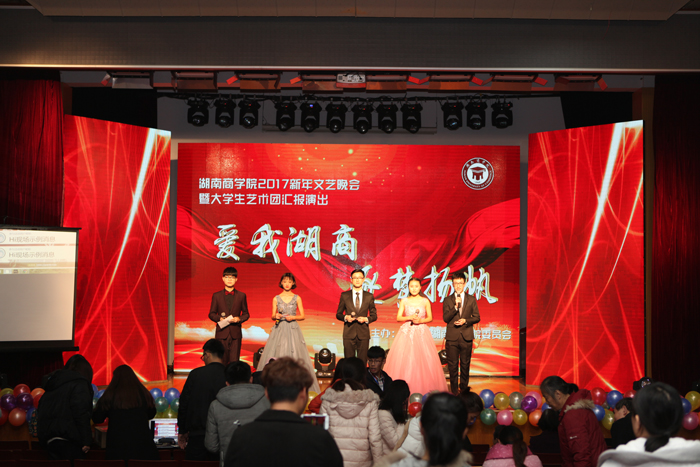 12月17日晚,湖南商学院2017新年文艺晚会暨大学生艺术团汇报演出在大礼堂举行。此次晚会以“爱我湖商,逐梦扬帆”为主题,由共青团湖南商学院委员会主办。 ![]() ![]() ![]() ![]() ![]() ![]() ![]() ![]() ![]() ![]() ![]() ![]() ![]() 校党委书记唐亚阳,校长陈晓红,副校长曾伏秋,校党委委员、党政办主任杨良奇及共青团湖南省委学校部部长王虹彬、科长王卓卓,岳麓区团委书记谈玉璜,长沙市岳麓一小党委书记刘慧,长沙中加学校加方副校长梁晓,长沙中加学校团委书记陈丽佳,全国文明单位长华社区雷锋号志愿服务站站长王爱萍等领导和嘉宾莅临晚会现场。 伴着健美操《逐梦湖商》活力四射地表演,新年文艺晚会正式拉开序幕。晚会节目丰富精彩,取自《江姐》的民族舞《绣红旗》讲述了一代又一代的年轻人追求民族崛起、国家独立的赤子之心;朗诵表演《以厚德载物,建文明校园》以激昂的声音歌颂了学校基层员工对校园建设做出的贡献,表达出湖商学子对校园未来的美好期许。聪明果敢美猴王,一招一式都是非物质文化遗产的传承;夺人眼球的魔术,独特的傣族舞,倾情演绎的《湖商版南山南》,青春洋溢的吉他弹唱,气势磅礴的《阳光路上》……引发观众阵阵掌声。 校党委书记唐亚阳与校长陈晓红同台表演。太极舒展大方,刚柔相济,歌唱清亮优美,寓意深长,现场气氛瞬间被引爆。 晚会互动不断。不仅有微信上墙即时互动,更是有现场抽奖活动。 新的一年即将到来。书记唐亚阳与校长陈晓红在现场为大家送祝福,用2017生肖火鸡的优秀品质,祝福大家在新的一年诚信、勤劳、进取,让优秀、勤奋、文明成为一种习惯,并表达了湖商学子与湖商一起进步的期许。(文/张惠芳 肖菁 图/程家乐 罗人宾)