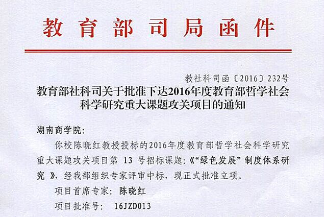 近日,2016年度教育部哲学社会科学研究重大课题攻关项目立项结果揭晓,我校校长陈晓红教授领衔申报的《“绿色发展”制度体系研究》获准立项。