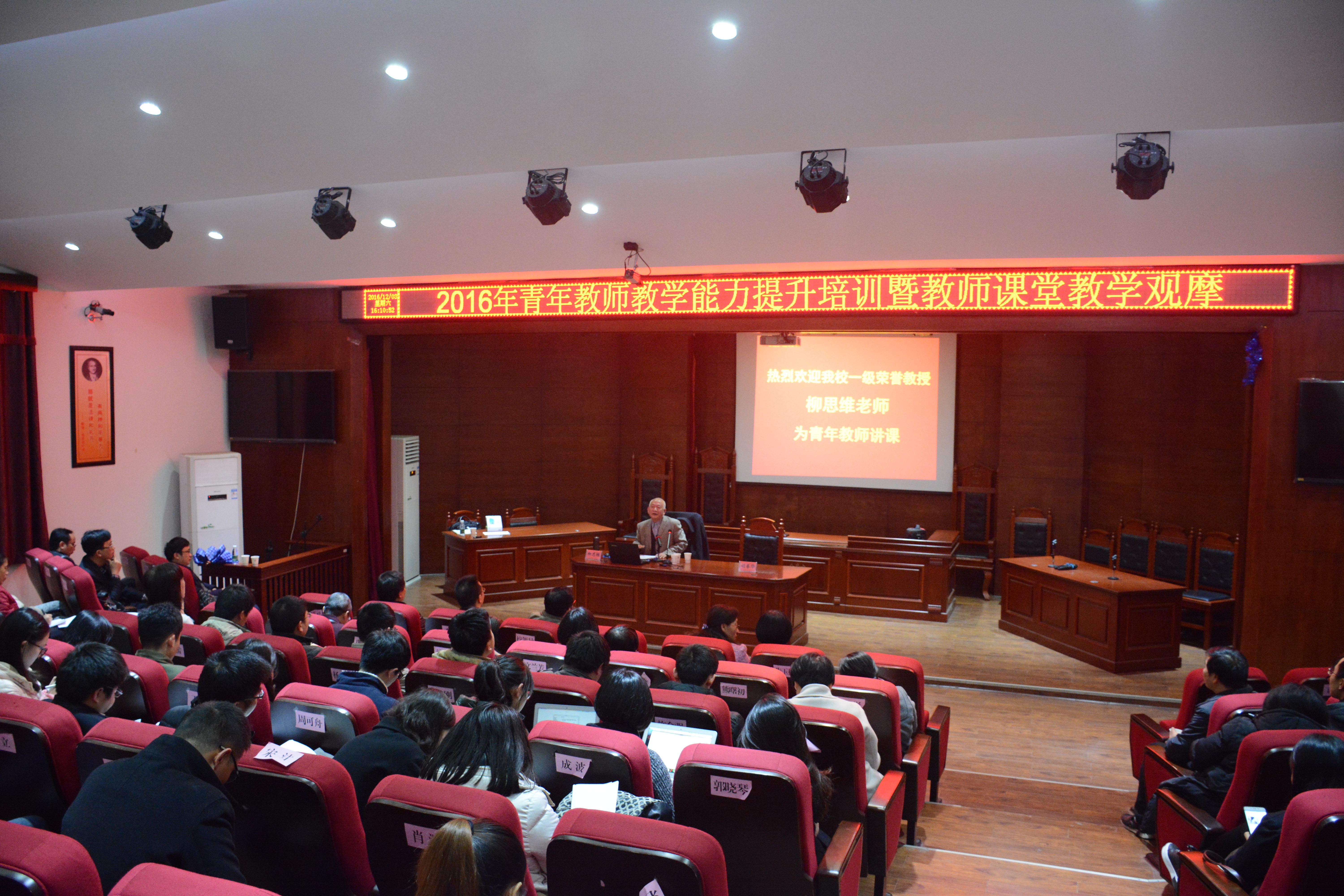 12月3日,由教务处、人事处、工会共同主办的青年教师教学能力提升培训暨教师课堂教学观摩活动在乐知楼F101举行。副校长刘国权出席开幕式并致辞。教务处、人事处、工会及各二级教学单位教学负责人、青年教师以及相关教学部门等100余人参加了活动。此次观摩活动分为教学示范课观摩和专题讲座两部分。 教学示范课观摩上,2016年湖南省“形势与政策”课堂展示活动一等奖获得者、马克思主义学院聂智老师主讲《通道会议话“通道” ——学习习近平总书记纪念红军长征胜利80周年讲话精神》。聂智老师讲课思路条理清晰,声音铿锵有力,循循善诱,把思想政治工作贯穿于教育教学全过程。2016年湖南省课堂教学竞赛一等奖获得者、财政金融学院王韧老师主讲了《保险利益原则》。王老师采用角色扮演的案例式教学方法,寓教于乐,讲解深入浅出,课堂气氛活跃、互动性强。两位获奖老师的课堂教学为青年教师做出了良好的示范。 本次活动还邀请了我校一级荣誉教授、经济与贸易学院院长柳思维教授,湖南师范大学教育科学学院博士生导师刘旭教授、湘潭大学文学与新闻传播学院博士生导师宋德发教授作专题讲座。 柳思维教授以“大学教师的师德师风建设”为主题,结合自己丰富的人生阅历,强调了新形势下师德师风建设的重要性,提出了目前大学教师在师德师风建设中存在的不足,以及教师如何坚持把立德树人作为教育教学的中心环节,在教学过程中育人,努力塑造学生的崇高人格,并对在场的青年教师提出了殷殷期盼。