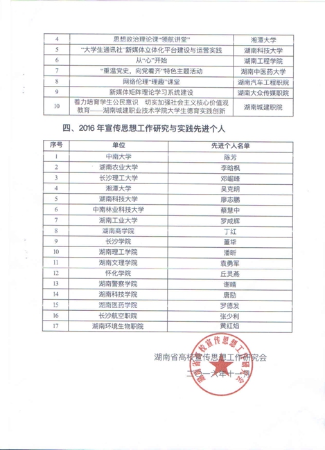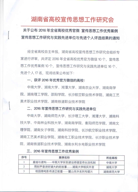 11月26日,湖南省高校宣传思想工作研究会2016年年会暨湖南省高校宣传思想工作骨干培训会在长沙举行。湖南省教育厅党组成员、省委教育工委委员陈飞跃、省教育报刊集团总经理熊名辉、省委教育工委宣传部部长曾力勤、省互联网信息办公室网络舆情处处长彭永、省委教育工委宣传部副调研员崔恒源等出席会议。 本次评选活动,旨在进一步加强和改进高等学校宣传思想工作,充分调动广大高校宣传思想工作者的积极性、主动性和创造性,提升高校宣传思想工作水平。经全省高校自主申报,湖南省高校宣传思想工作研究会组织专家进行评审,共评选出2016年全省高校宣传思想工作研究与实践先进单位16个,优秀官方微信10个和宣传思想工作优秀案例10个。