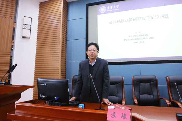 苏竣教授就清华大学的科研工作以及本人和团队最近关注的问题,与在座的师生展开交流。首先,他概述了科技政策的研究背景、数据显示,摩尔定律正在逼近极点,专利申请量激增,持续不断发展变化,超出我们的预料。通过美国与中国研发投入的变化分析,他指出,我国科学技术活动赶超世界先进水平任务任重道远,其中,我国在基础研究投入比例上相差太大。 讲座中,苏竣教授重点阐述了政策反馈、政策组合、政策扩散三个问题。他表示,政策反馈是政策理论的新发展,政策组合的协调性与相容性决定了政策实施效果。政策之间的竞争非常鲜明,研究政策在不同组织、部门的扩散十分有意义。随后他简要介绍了科技规划、经费投入、科技金融等十种单一政策工具。他认为,政治工具是政策进行分析的有效方式,反映了政策的基本价值和理念,对政策工具分析应是以小变大的。最后,他简要分析了选择性政策的困境与政策文献量化研究。 提问环节,苏竣教授详细回答了在座师生所提出的问题。与会人员纷纷表示,通过聆听苏教授的讲座,不仅从通俗易懂的案例中学习到了国际最前沿的公共科技知识与专业学术规范,而且还在现场感受到了演讲的热情和学者严谨的态度。(文/吴丽都 图/陈璐明)
