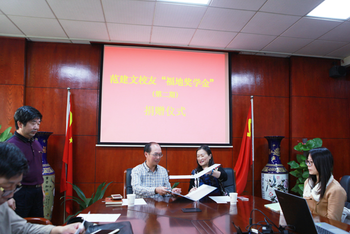 10月11日,范建文校友“福地奖学金”( 第二期)捐赠仪式在二办702会议室举行。校长陈晓红、党委副书记兼校友总会常务副会长夏继春出席,学校校友办、学生处、研究生院、教育基金会、关工委等部门负责人及建档贫困学生代表参加了捐赠仪式。捐赠仪式由夏继春副书记主持。 ![]() ![]() ![]() 范建文校友在讲话中深情地回忆起自己在母校求学的日子。当年由于家境贫困,连温饱都难以解决,是母校的关怀和帮助,使自己得以克服困难,顺利完成学业。也是由于母校的培养教育,使自己各方面得到锻炼,能够成长成才,顺利就业。在自己艰苦创业的过程中,又得到母校老师和同学的关心与帮助,自己对母校始终充满着深厚的感情和诚挚的感激。今天自己事业上小有成就,理应回报母校。奉献爱心,帮助家庭困难的学弟学妹完成学业,早日成材。他勉励学生多读有灵魂的书,做有灵魂的事业,特别要做灵魂高洁的人。他希望通过自己的捐赠,能够使更多的贫困学子树立信心,克服困难,顺利完成学业,早日成才。同时也希望带动更多的人传承爱心,为母校、为社会作出贡献。 “福地奖学金”(第一期)获奖学生代表、法学1303班胡洁同学在发言中激动地表示,范建文学长的“福地奖学金”不但帮自己解决了部分生活上的困难,更重要的是给了自己战胜困难、发奋学习的信心和动力,她将以优异的成绩感谢学长的无私关心和帮助。她说:“毕业之后,也要像学长一样,努力拼搏;像学长一样,帮助更多需要帮助的人。” 陈晓红校长代表全体师生对范建文校友的再次慷慨捐赠表示衷心感谢。她高度赞扬范建文校友艰苦创业、坚忍不拔、勇于拼搏的企业家精神和感恩母校、回馈社会、奉献爱心的义举。她勉励在校学生像范建文学长学习,做一个有爱心、有奉献精神、有社会责任和担当精神的人,并要求在全校范围内大力宣传像范建文这样优秀校友的感人事迹,激励全校学生发奋学习,努力成才。她说,有能力的人能够成就事业,但是只有具有奉献精神、责任心和爱心的人才能推动社会的前行。 范建文校友1992年毕业于我校物价专业。自幼家境贫困,在校学习期间勤奋刻苦,成绩优秀。毕业后自主创业,历经多年艰苦奋斗,事业有成。现任广东福地物流有限公司董事长,并担任学校校友总会常务理事和广州校友会秘书长。 范建文校友一直以来对母校充满深厚感情,关心母校建设发展,关爱母校学子,在2009年11月母校60周年校庆期间,曾捐赠20万元,率先设立校友奖学金“福地奖学金”,至2014年发放完毕,已累计资助贫困优秀学生120余名。 今年又主动提出再捐赠50万元,继续设立第二期“福地奖学金”,用于资助母校更多贫困优秀学生顺利完成学业。(文/校友办 摄影/陈璐明) 责编 陈璐明