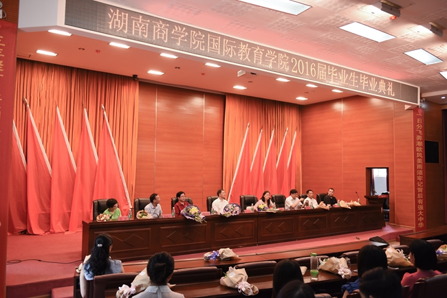 6月20日下午,国际教育学院在学校多功能报告厅隆重举行2016届毕业生毕业典礼。校党委书记唐亚阳、校长陈晓红、副校长曾伏秋出席典礼。典礼由国际教育学院院长张漾滨主持。 典礼开始前,毕业生代表向出席典礼的领导和老师献花,表达对学校的深情谢意。在庄严的国歌声中,毕业典礼正式开始。副校长曾伏秋宣读了《湖南商学院关于准予敖凌峰等同学毕业的决定》和国际教育学院省级、校级优秀毕业生名单,今年国际教育学院共有毕业生228名,其中71名出国深造,36名全日制专升本。