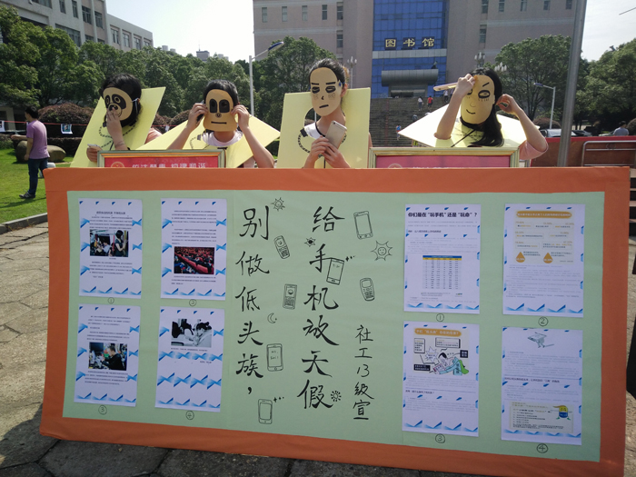 6月16日上午,我校英才广场出现了四个扮相“奇怪”的人引起了许多同学的注意。这四个人戴着迥异面具,头入枷锁,手被镣铐却还拿着手机不肯松手。 ![]() 原来,这是我校公共管理学院社工1301班同学举办的“别做低头族,给手机放天假”的校园文明倡导活动,四位被手机“束缚住”的同学正是在吸引同学们驻足,并试图引起同学们对“低头族”现象的反思。“我们活动旨在提倡大家减少手机的使用习惯,特别是在课堂。”活动主办者告诉记者。活动过程中,不断有同学试戴“镣铐”体验了一把“被手机绑架”的感觉。 除了“你被手机绑架了吗?”的行为艺术表演,本次活动还包括了手机危害的宣传长廊,里面有“想象中你是手机的主人,现实中,手机是你的主人”、“你被手机绑架了”等标语,也有很多精心选取的彩色漫画,一对情侣在约会,女生对男生说:“你还是把手机绑在我头上吧,这样你至少可以看着我。”标语与漫画既诙谐有趣又发人深省,也令现场人气火爆。同时,每位经过的同学还可以在“别做低头族,给手机放天假”的横幅上签名,提醒自己减少使用手机的频率。此外,倡导校园文明的第二个活动“引导垃圾分类”也在如火如荼中进行。 据悉,本次活动主要来自公共管理学院社会工作的社会行政专业课,上这门课的刘秀丽老师别出心裁,希望同学们能做一次有利于校园文明建设活动策划来作为这门课的期末考核,2015年社工1201班的同学曾举办了社工系第一届校园文明素养活动,此次活动为社工系第二届文明素养活动。刘老师表示,这类活动将在我校社工系革新并持续举办。此外,全班同学还策群策力拍摄了《考试占座与舞弊》、《滴雨的伞应该和人的距离》等校园文明倡导主题的微电影,为校园文明建设献出自己的一份力。(公共管理学院供稿 陈薇)