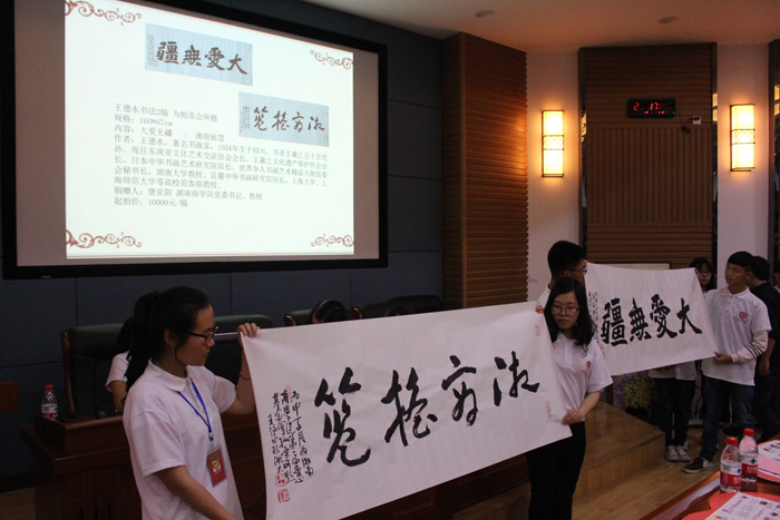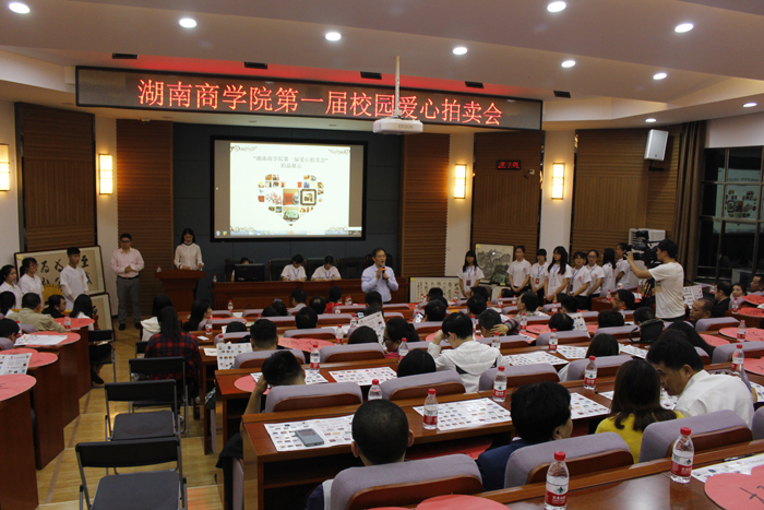 爱聚湖商,情暖天下;爱心捐赠,感恩有你。为深入践行社会主义核心价值观,培育积极向上、团结互助的校园文化,同时为贫困学生筹集爱心资助款,5月27日晚,我校在乐知楼F201举办第一届爱心拍卖会。校党委书记唐亚阳、党委副书记夏继春、纪委书记陈丽影、副校长曾伏秋以及长沙、邵阳、衡阳、广州、东莞、深圳等地的校友,我校老师和长沙市发展基金会的有关同志出席本次拍卖会。此次拍卖会由校长陈晓红倡议发起,集结了唐亚阳书记、陈晓红校长等校领导、教职工、校友及爱心人士爱心拍品70多件。