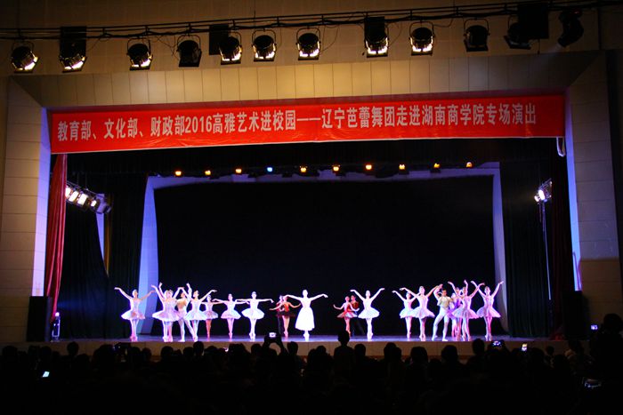 5月11日晚,教育部、文化部、财政部2016高雅艺术进校园——辽宁芭蕾舞团湖南商学院专场演出在体育馆举行。校领导陈晓红、夏继春、彭进清、陈丽影、曾伏秋、刘国权、聂国卿,我校一级荣誉教授柳思维与师生共同观看了辽宁芭蕾舞团带来的精彩表演。