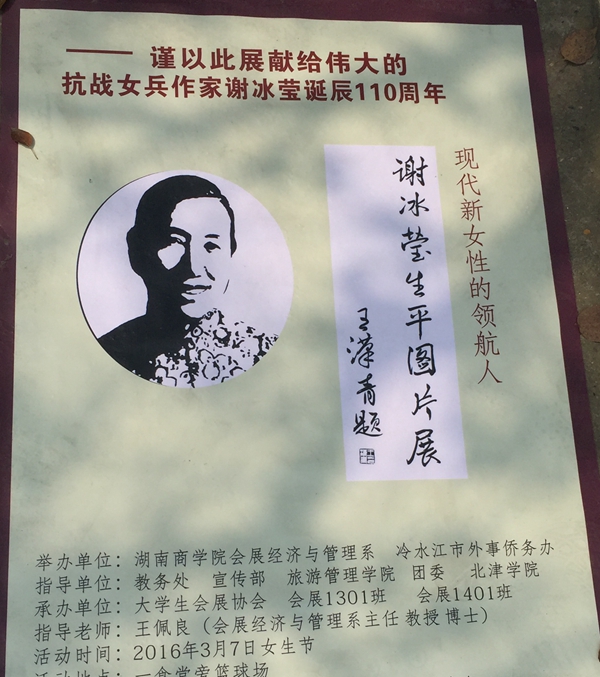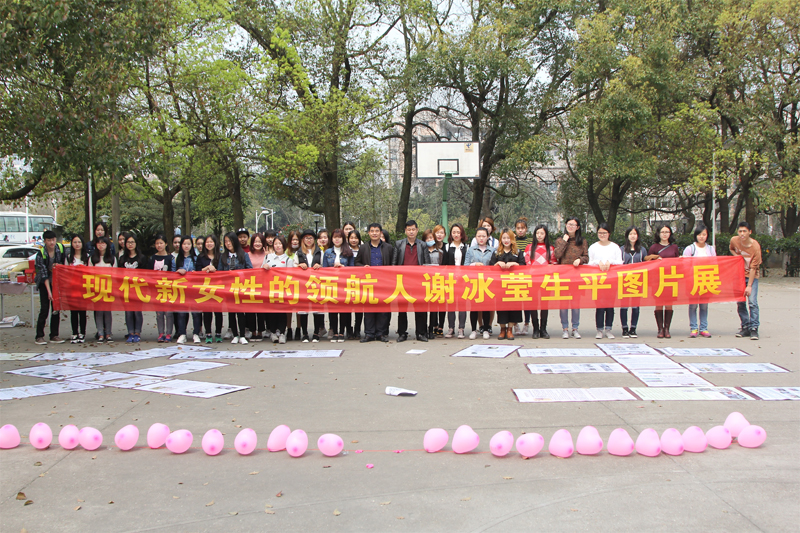 3月7日,又逢女生节,为激励广大女生自立自强,追逐梦想,不断创造人生辉煌,湖南商学院旅管学院会展经济与管理系与冷水江市外事侨务办共同举办“现代新女性领航人谢冰莹生平图片展”,度过一个别样的“女生节”。 ![]() 谢冰莹是湖南新化人(今属湖南省冷水江市铎山镇),1927年以《从军日记》轰动文坛,法国大作家罗曼·罗兰称赞她是“努力奋斗的新女性”。1936年,她因抨击溥仪卖国行径,被日本当局关进监狱,遭受严刑拷打,身心倍受催残。1937年,她怀着家仇国恨,组织“湖南妇女战地服务团”,在戎装照片上题写“不灭倭寇,誓不生还”,深入抗战第一线,相继发表《新从军日记》、《在火线上》、《战士的手》、《第五战区巡礼》、《姊姊》、《梅子姑娘》、《写给青年作家的信》、《抗战文选集》等畅销作品,成为抗战时期最活跃影响最大的作家之一。1948年,她前往台湾师范大学任教,1974年移居美国旧金山,直至2000年逝世。她一生共出版80多种365部2000万字的著作,被誉为“中国新文学史上‘女兵’文学的祖母”。她一生充满传奇,曾三次逃婚,是中国女性命运的典型代表;她是国民革命和中国妇女解放的先驱,是中国现代新女性的领航人;她早年成名于大陆,中年任教于台湾,晚年侨居美国,具有世界声誉和影响力,是梅山文化哺育的一朵奇葩。 湖南商学院党委书记王汉青欣然为此次活动亲笔题写“谢冰莹生平图片展”。 湖南省文化厅副厅长鄢福初、湖南商学院北津学院院长陆远如以及邬体书法传人邬江湾亦热心参与,创作纪念谢冰莹的书法作品。湖南省伏羲文化研究会常务副会长周行易欣然创作对联“冰心曾鉴梅山笔;莹角犹闻战士歌。”师生将20余张110厘米高、70厘米宽的谢冰莹生平写真,在地上平铺成“女生”二字,通过抽奖互动,引导学生仔细阅读图片,寻找答案,深度了解谢冰莹。湖南教育电视台、三湘都市报、华声在线等媒体对此次活动进行了报道。(王佩良) 责编:陈璐明
