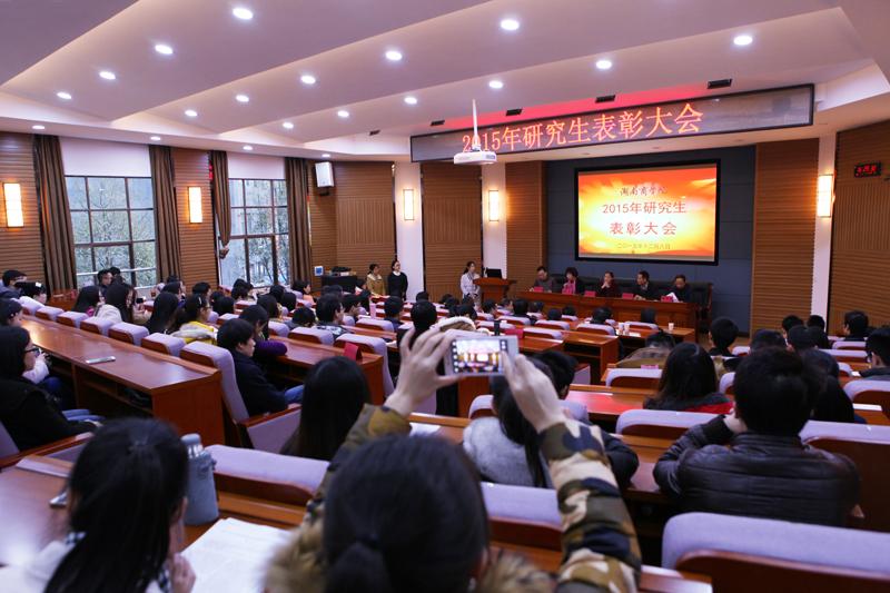12月8日,学校在乐知楼F201报告厅隆重召开2015年研究生表彰大会,校长陈晓红教授、省学位办主任余伟良、校领导杨虹教授出席会议。研究生院负责人、各研究生二级培养单位分管领导、学科竞赛指导教师代表、研究生干事、研究生班主任和全体研究生参加会议。会议由校领导杨虹教授主持。