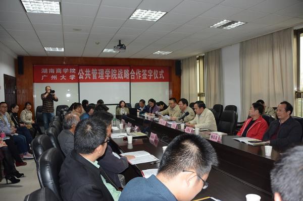 10月30日下午,我校公共管理学院与广州大学公共管理学院战略合作签约仪式在二办401室举行,校党委书记王汉青,副校长王明高,党委委员、组织部部长胡穗出席,党政办、教务处、公共管理学院负责人和师生代表等参加签约仪式。仪式由校党委委员、组织部部长胡穗主持。 王汉青书记以“秉持合作互信理念,共创两校公共管理发展新未来”为题发表致辞,代表学校党委对各位专家学者和嘉宾的到来表示热烈欢迎,向关心支持湖南商学院发展的各位朋友表示衷心的感谢。他指出,时代的发展日新月异,我们正昂首跨入大数据时代、政府3.0时代和工业4.0时代,高校作为思想和知识生产圣地,必须研究新问题,引领时代潮流。当前,我校结合高等教育发展趋势,结合湖南经济社会发展态势,紧扣学校发展实际,提出了“三升三旺”的发展目标和事业愿景,全校师生员工正在团结一心努力建设高水平财经大学。