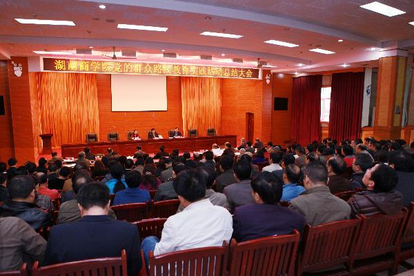 11月13日下午,我校党的群众路线教育实践活动总结大会在图书馆多功能报告厅召开。省委派驻高校第五督导组全体成员、在校校领导、退休领导代表、中层干部、各民主党派负责人、高级技术职称代表代表、学生代表等参加了会议。校党委书记王汉青代表学校党委作了教育实践活动总结报告,省委派驻高校第五督导组杜纯梓在大会上做了重要讲话。大会由校长陈晓红主持。