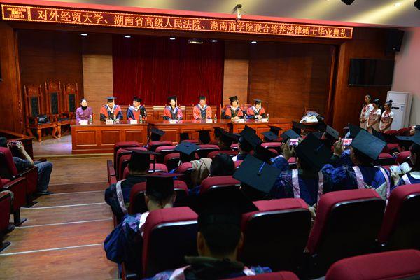 11月8日下午,对外经济贸易大学、湖南省高级人民法院、湖南商学院联合培养法律硕士毕业典礼在我校模拟法庭举行。