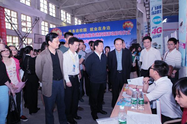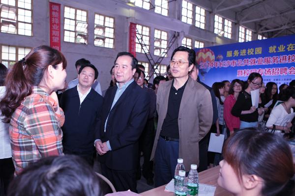 校长唐未兵、省人力资源和社会保障厅副厅长蔡畅元、副市长何寄华查看招聘情况