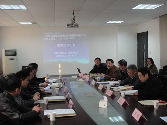 1月25日,受科技部委托,湖南省科技厅组织有关专家,对我校唐未兵教授主持的国家软科学研究重大招标项目《科技促进经济发展方式转变的评价方法和体系研究》(2011GXS1B001)进行了结题验收。省科技厅姜郁文总工程师主持结题验收会议,科技部办公厅调研室副主任刘琦岩,国家、省专家和省科技厅政策法规处有关负责人,及课题组成员参加了会议。