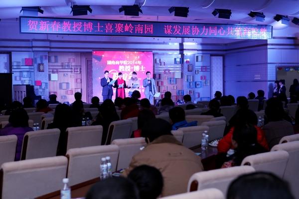 1月9日,我校2014年教授博士联谊会在岭南校区科技楼三楼多功能报告厅举行。校领导欧阳峣、唐未兵、夏继春、彭进清、杨虹、陈丽影、聂国卿、刘国权、李泽华、廖明星与200多名教授、博士代表欢聚一堂,庆祝新年。联谊会由校党委副书记夏继春主持。
