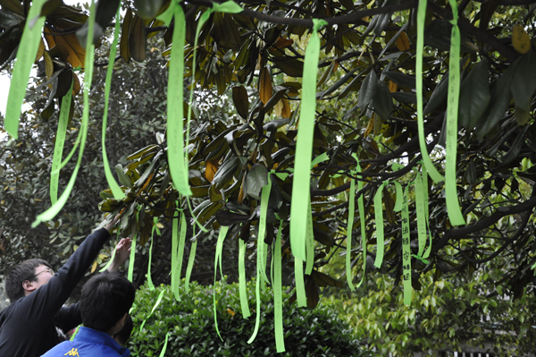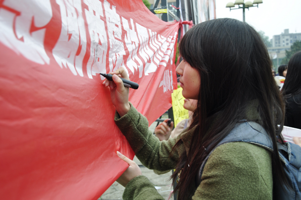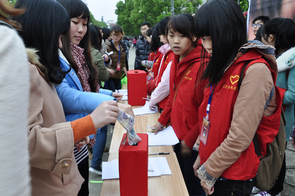 4月23日,由校团委主办,校青年志愿者协会承办的&“祈福雅安,四川加油&”募捐活动在英才广场举行。青协的志愿者们在祈福喷绘前搭起了临时募捐处。青协会长告诉记者,本次募捐活动中法学院和四川老乡会以集体名义分别捐款2219元和1583.2元。最终募集的10928元将以 学校名义通过正规渠道实现其爱心价值。届时,青协将通过网络平台和宣传板报对捐款渠道以及款项最终去向进行公示。此次募捐活动的同时,还进行了绿丝带祈福活动。&“地震,震不碎的是我们的心&”、&“雅安不怕,有爱就会有奇迹&”。丝带上写着同学们对灾区人民的牵挂和祝福。