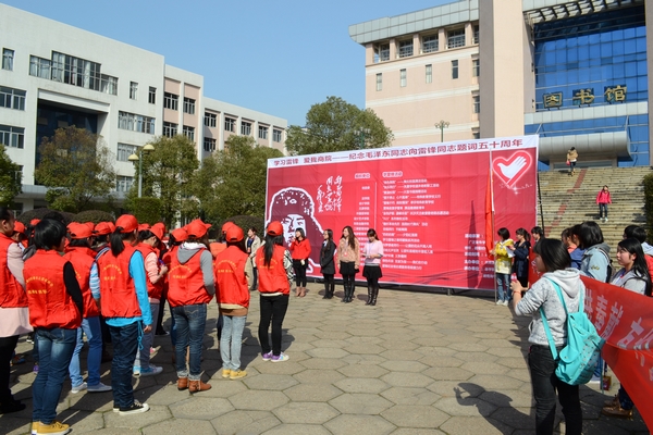 3月5日,是毛泽东同志&“向雷锋同志学习&”题词50周年纪念日。为弘扬雷锋精神,由共青团湖南商学院委员会主办,各学院分团委、湖南商学院青年志愿者协会承办的&“学习雷锋 爱我商院——纪念毛泽东同志向雷锋同志题词50周年&”主题教育实践活动正式启动。