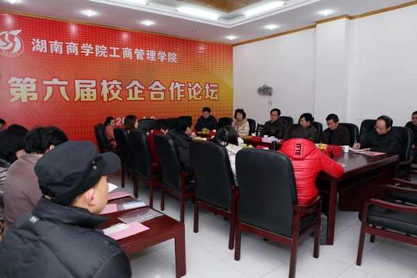 1月9日下午,工商管理学院第六届校企合作论坛召开,校长唐未兵、副校长杨虹,省教育厅高教处处长唐利斌出席会议。来自花旗银行、国药控股、真维斯、通程集团、潍柴动力、酒鬼酒、百度竞网等企业的人力资源总监及学校教务处负责人参加会议。会议由工商管理学院院长黄福华主持。