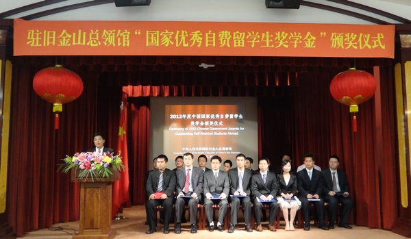 最近,2011年度&“国家优秀自费留学生奖学金&”颁奖典礼在中国驻旧金山总领事馆隆重举行。教育组邵巍参赞主持典礼,高占生总领事在颁奖典礼上讲话,并为获奖的23名学子颁发了奖状和奖金。我校党委书记欧阳峣教授在斯坦福大学做高级研究学者,应邀到中国驻旧金山总领事馆参加颁奖典礼。