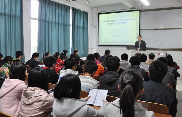为使2011级经济学专业学生尽快加深对经济学的认知,从而帮助他们更好地进行自我定位及未来的职业规划。10月25日下午,校长唐未兵教授在E303教室举行了题为&“‘国家第二类特色专业’经济学专业2011级专业思想教育&”的讲座。