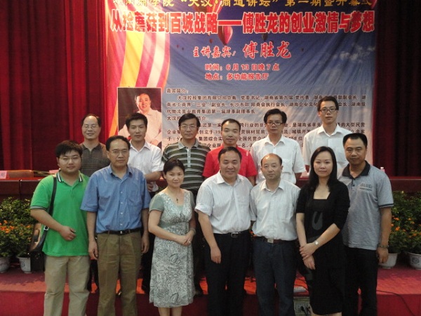 6月13日晚,由经济与贸易学院主办的湖南商学院&“大汉•商道讲坛&”第一期暨开幕式在多功能报告厅举行,本期讲坛主题为&“从捡蘑菇到百城战略——傅胜龙的创业激情与梦想&”,邀请湖南省大汉控股集团有限公司总裁、党委书记傅胜龙先生为主讲嘉宾, 经济与贸易学院院长刘天祥主持讲座。