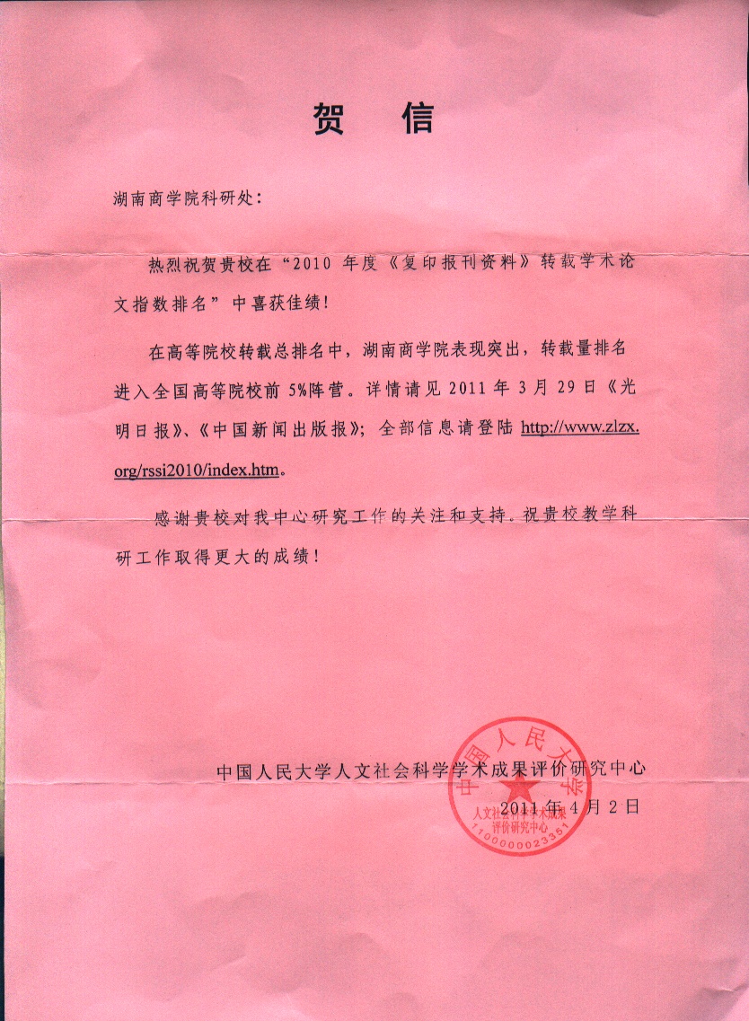 日前,我校收到中国人民大学人文社会科学学术成果评价研究中心的贺信,祝贺我校在&“2010年度《复印报刊资料》转载学术论文指数排名&”中喜获佳绩。贺信写道:在高等院校转载总排名中,湖南商学院表现突出,转载量排名进入全国高等院校前5%阵营。 责编:陈璐明