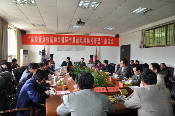 3月30日下午,省预防腐败局副局长胡海鹰、省委教育工委纪工委书记周德义等领导组成的廉政建设调研组来我校调研,并在我校二办公楼702会议室举行了&“高校重点领域和关键环节廉政风险防控管理&”座谈会。校领导唐未兵、夏继春、李泽华、彭进清、王明高、陈丽影及相关兄弟院校纪委、监察室负责人出席了座谈会,我校相关职能部门负责人及参与预防腐败法立法研究的博士代表参加了座谈会。会议由省委教育工委纪工委书记周德义主持。