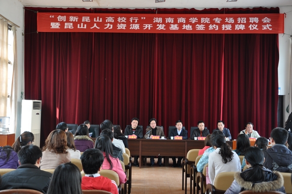3月27日下午,&“创新昆山高校行&”湖南商学院专场招聘会暨昆山人力资源开发基地签约授牌仪式在我校三食堂二楼学生活动中心举行。副校长曾伏秋出席授牌仪式,招生就业指导处处长杨良奇、昆山人力资源市场管委会主任王建龙以及六大招聘单位相关负责人参加了该会议。会议由杨良奇处长主持。