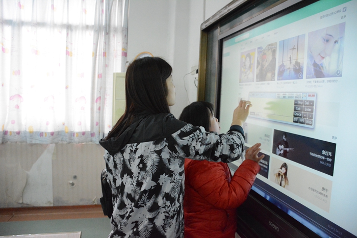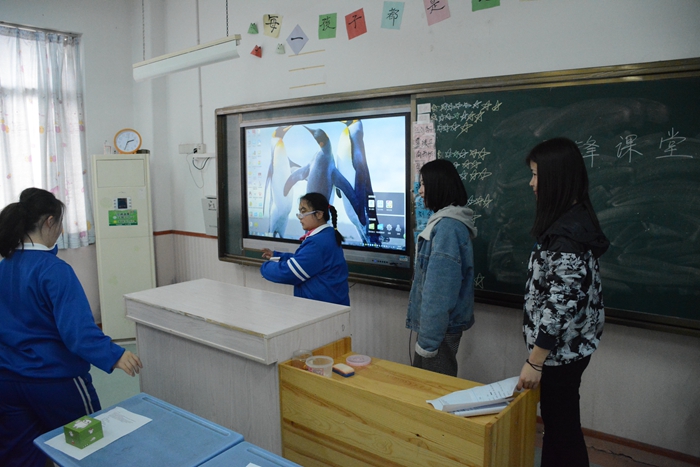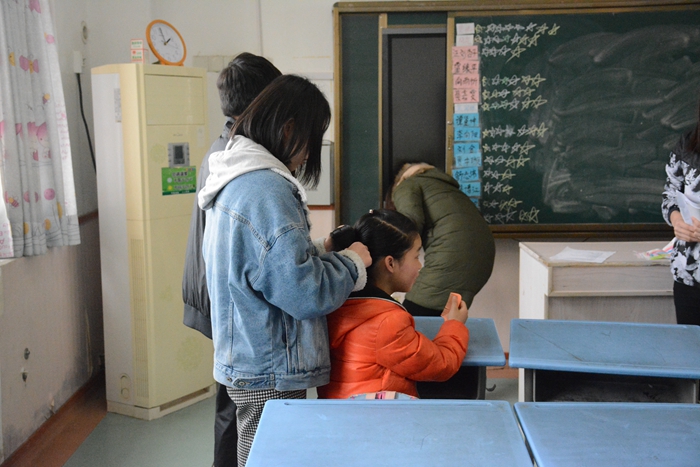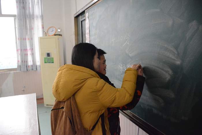 在门卫处登记过后,我们来到了会计学院青协已经“守护”了近三年的14班,这时离上课还有十分钟。孩子们和常来的干事周雨潇已经很熟悉了,一进门就缠着她要听歌,她对这一切驾轻就熟,应对自如。