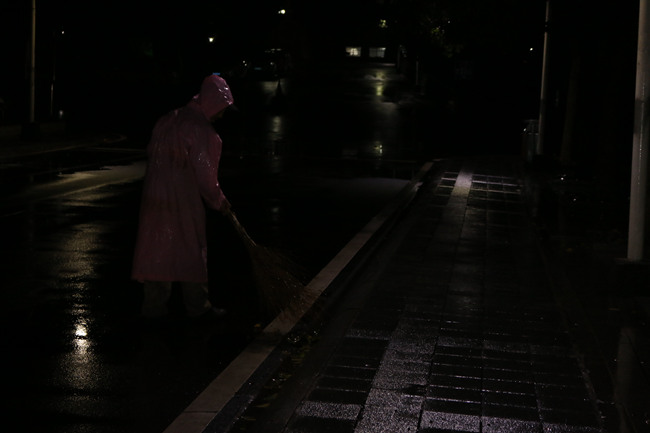 长沙的气温骤降到了2℃。6点,天空飘着毛毛细雨,寒风凌冽。借着保安室的些许亮光,他熟练地拿起扫帚,趁早上车少人少开始清理路道。