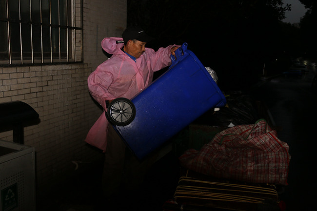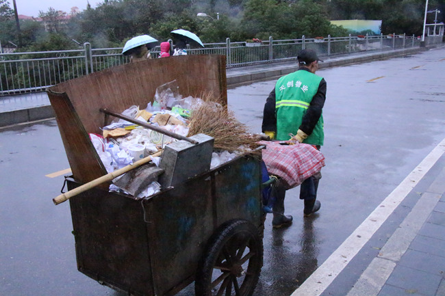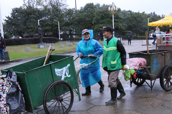8点,他拖着满满的一车垃圾,从三教穿过大半个校园走向三食堂后的垃圾集中处理地,这位67岁的老人有些步履蹒跚。因为没有撑伞,不时有雨点打在他的脸上。