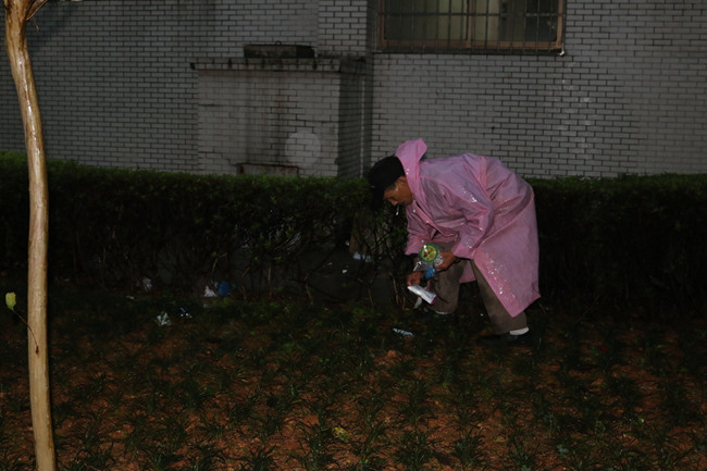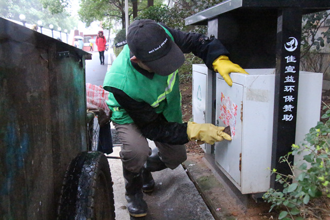 途中看见垃圾桶上贴有小广告,他停下来耐心地铲掉。他说:“尽管有人负责铲除这些东西,但我看到了就要铲掉。尽自己的一份力吧。”