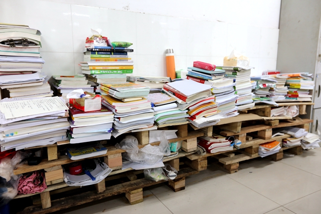 为了给学生提供更多的放书地方,暑假期间,她顶着炎炎烈日来回10多趟,将二教装修的一些边角料搬到自习室,自己动手做成了6个这样的简易书架。