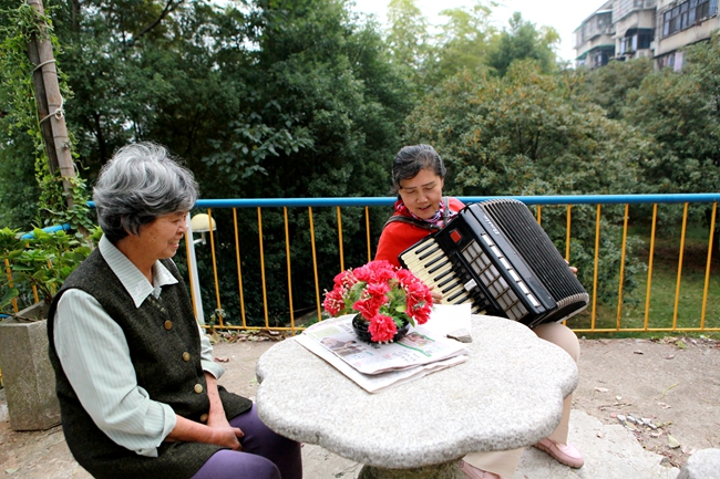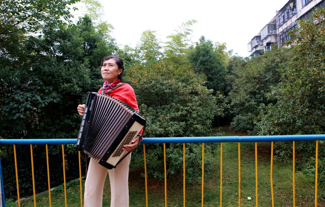 晚饭后,石君在她家后院拉起了手风琴。这台手风琴是她20年前从新疆带来的。闻声而来的老朋友给她拿来家里的花做摆设,欣赏起她的《莫斯科郊外的晚上》。