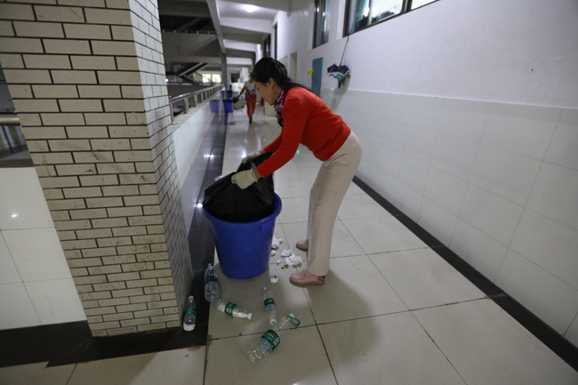 晚上9点半,一楼和四楼自习室的学生大多离开,她开始和勤工俭学的学生一起打扫卫生。
