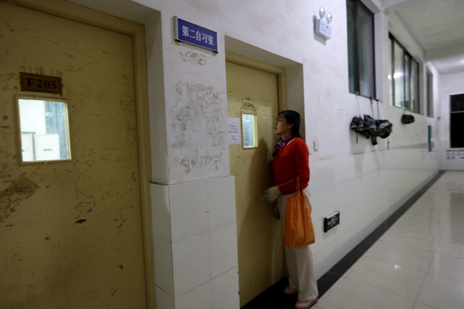 10点,打扫完一楼和四楼的自习室,她来到二楼自习室。这间自习室多是考研的,学生们走得最晚。她透过小窗观察里面的情况,不忍推门进去打扫。她说,离考研只有72天了,每一分钟对他们来说都太重要了。