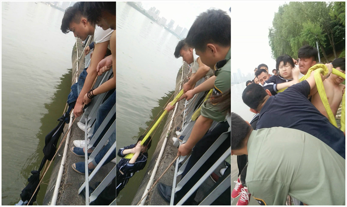河面宽阔,水波荡漾的湘江,流经长沙橘子洲奔腾北去。4月30日下午6点,一场惊心动魄的父女二人落水,众人合力将其成功救起的故事就发生在橘子洲。从呼救到脱险,只有20分钟左右时间。20分钟,对参与救援的湖南商学院六名大学生来说,却足以铭记一生。 五一小长假的第二天,我校设计艺术学院大四学生徐守宝和他的五位同学许彪、任雪婷、唐嘉欣、刘美美、闫娜打算前往橘子洲附近游玩,当他们一行人走到橘子洲景区地铁2号口时,突然听到呼救声:“有人落水了!”紧接着扑通一声,一个身影扑入水中。 来不及多想,徐守宝一个箭步冲向事发点。当时,一个穿着校服的女孩失足落入水中,浮在水面,离岸边有两三米远,父亲立马跳下去救女孩,靠在岸边的石壁上。但当时,石壁离大桥有几米远,周围没有任何设施可以攀附,父亲多次试图救起女儿,但在水中根本使不上力气。危急时分,一位路人从旁边的竹林中捡来一根枯萎的长竹竿,递给水中的父女,好让他们不被江水冲走。“我不会游泳,我不能跳下去,但我一定要想办法救人”。徐守宝的身边是许彪,用手扶着他的肩膀,他的身后是任雪婷、唐嘉欣、刘美美三位女生,用手紧紧拽着他的衣服,保证他不掉下去。据徐守宝回忆:“当时水流虽有些湍急,但是看到父女俩抓住了竹竿,终归还是能靠自身的浮力,不至于沉入水中。他一直悬着的心,便稍稍舒缓了一点。” 对于如何把人救上来,施救队伍有了不同意见,年纪不大的徐守宝,展现了年轻人少有的沉稳。他一边平复自己紧张的心情,一边冷静地思考并寻找解决方法。“这个竹竿并不是完整的,下端有腐朽的部位突出,要是竹竿内部断裂,父女的生命将再次受到威胁。”这时,有位妇女提出将衣服脱下绑在一起,结绳营救。大家很快凑集多件衣服,制成营救绳,放入河中,让水中的父亲抓住。紧接着,又有人递过一根细绳,想让父女二人绑在身上,将他们从水中拽起来。此时,徐守宝紧紧攥住了衣服,并对众人准备使力拉绳表示顾虑:“细绳只有手指粗,根本难以支撑两个人的重量,而且系一起的衣服是临时组绑的,各种材质参差不齐,万一在拉他们上来的过程中,细绳或衣服中途断掉,后果将难以预测。” 与此同时,有人拨打了120,有人通知景区保安,有人呼喊江中的游艇过来营救。时间一分一秒地过去,女孩渐渐体力不支,由垂直向上的状态变为水平躺在江面上,生命意识逐渐微弱。终于,外围的支援很快就到了,景区工作人员递过来一根专业的救援绳,徐守宝打好结,抛下去,父亲很利索地套在女儿腰上,“一、二、三…一、二、三”,众人使劲,在小女孩的身体离护栏还有半米左右时,徐守宝毫不犹豫地探出腰,伸出手,一口气把她抱了上来。 身高183cm,体重120斤的徐守宝,用他清瘦的双臂稳稳地抱住了惊魂未定的女孩。徐守宝说,自己平时似乎没那么大的力气,能抱起一个100多斤的人。紧急关头他使出了浑身的力气,体内的能量被无限激发。“不让一个生命轻易流逝,才创造了奇迹吧。”他笑着说。 徐守宝的大一学妹闫娜,拍摄了这段6分58秒的救援视频,真实记录了大家齐心救起父女的感人画面。当落水少女被救起后,脸色苍白,双眼无神,心情久久难以平复。刘美美同学用自己温暖的双手捂紧她,传递热量,给她脱险后的安慰。当跳水救女的父亲被众人救起后,深深鞠躬,双膝跪地向大家致谢,此情此景,分外动容。那是对善意的感激,只有当生命消逝时,才会感到格外的珍贵。“生死就在一瞬间,以前从来没有这么近感受过。” 徐守宝说,经历过这次事件,他更能体会到父爱的伟大。 事后徐守宝的同学任雪婷说道:“当时徐守宝拉落水女生上来时,他的身子已经最大限度往前倾,我们生怕他也会掉下去,便死死拽住了他的衣服,现在回想的确很是后怕!” 赶来的救护车接走了父女俩后,徐守宝和同学们也在夕阳的余晖中转身离开。徐守宝觉得自己作为一个江苏人在湖湘大地上学习生活了四年,在学校、在城市随时都能感受到文明的氛围,而自己的“见义智为”只是做了一件平凡的小事。值得一提的是,这六名同学中,有三名是学生党员,有五位来自外省,四位同学即将毕业。 很多在场的人用手机记录了事件的全过程,视频通过微博、微信朋友圈迅速传播开来,对于救人善举,市民及许多外地游客都十分感动。一时间,这一温暖的爱心善举在社会上引起强烈反响。省委常委、市委书记易炼红对此作出批示:爱满星城,文明高地;父女被困,众人相救;可歌可泣,感人育人。目前,中央电视台、湖南日报、湖南经视、红网、长沙晚报、长沙政法频道、星辰在线等多家媒体对此进行了专门报道,新华网、凤凰网等多家新闻门户网站对此进行了转载。(文/张登霞 图/陈璐明 手机视频截图)